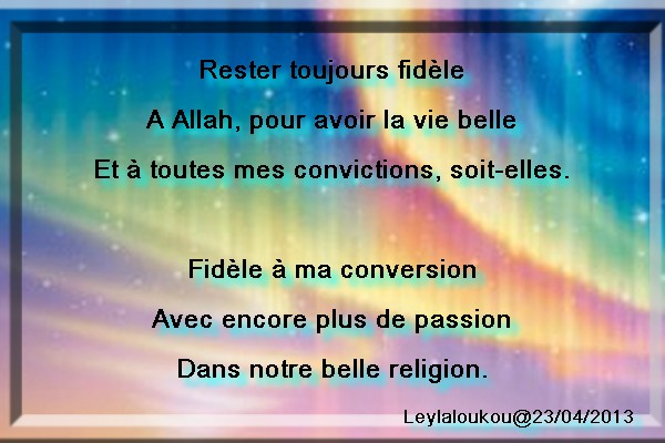 Je me présente Nathalie/LEYLA. Française,convertie à l'islam depuis 1992 ALHAMDOULILLAH. Mon blog vous faire découvrir l'ISLAM la vraie religion d'ALLAH L'Unique DIEU (Le Glorifié)et de Son Prophète Mohammed(saws),Le Saint Livre Coran. Car l'Islam est le chemin vers la vérité et pour l'amour d'ALLAH NOTRE SAUVEUR. AMIN